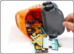 Die Puzzleteile lassen sich direkt im Kunststoff-Schulbus mit aufklappbarem Deckel verstauen. So haben Kinder Spiel und Aufbewahrung an einem Ort.