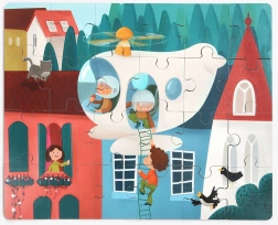 Spielerische und clevere Kombination: Ein Holzpuzzle mit 24 Teilen, verstaut in einem niedlichen Kunststoff-Helikopter auf Rädern. Die Teile sind auf der Rückseite nummeriert – für leichteres Puzzeln und die Förderung des logischen und mathematischen Denkens. Das Spielzeug dient zugleich als Aufbewahrung für das Puzzle und unterstützt Feinmotorik und Fantasie.