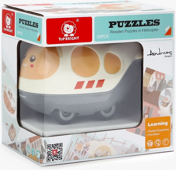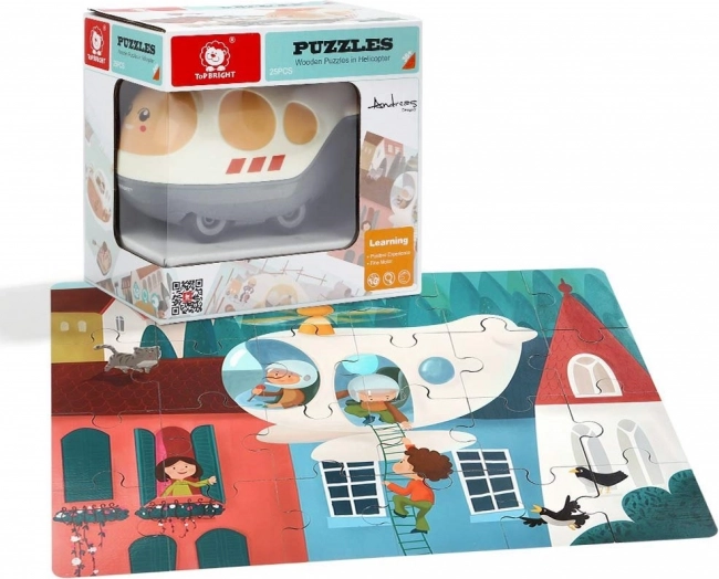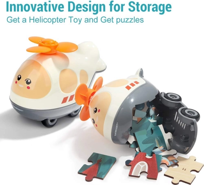 Entdecken Sie das clevere 2-in-1-Spielzeug: ein Holzpuzzle mit Fahrzeugmotiven und ein Kunststoff-Helikopter mit aufklappbarem Deckel zur Aufbewahrung der Teile und weiterer Schätze. Die Puzzleteile sind nummeriert, sodass Kinder sich leicht orientieren und das Puzzeln noch unterhaltsamer und lehrreicher wird.