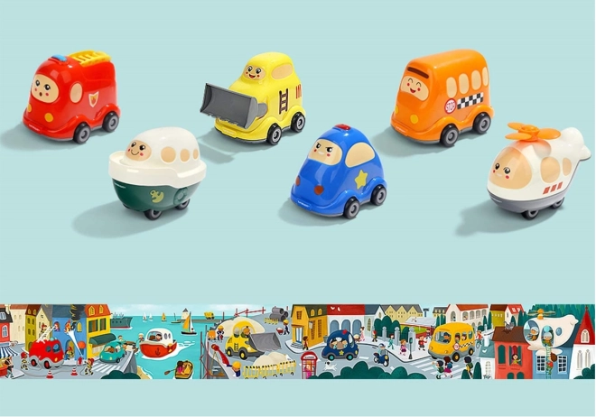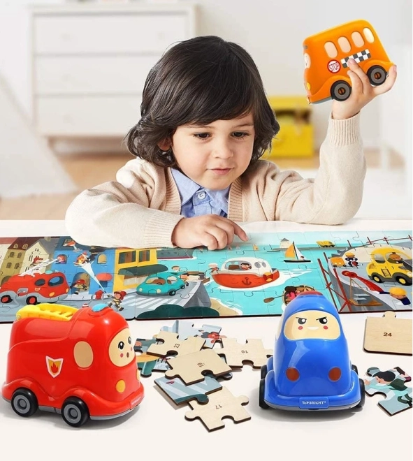 Mit weiteren TOP BRIGHT Modellen (Feuerwehr- und Polizeiauto, Schulbus, Bulldozer, Hubschrauber) legen Sie ein fließendes Panorama-Puzzle auf dem Boden.