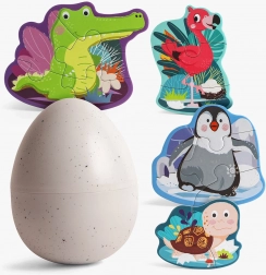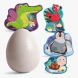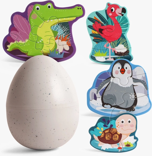Jedes Motiv hat auf der Rückseite den gleichen Druck und die Teile sind nummeriert, sodass Kinder schnell verstehen, was wohin gehört. Alles wird im stabilen Kunststoffei aufbewahrt, das sich leicht öffnen lässt und Ordnung zu Hause wie unterwegs schafft.