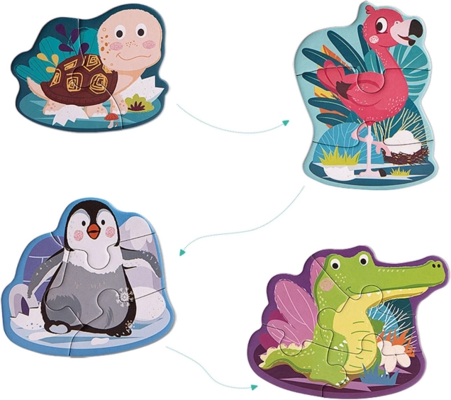 Vier Puzzles mit schrittweise steigender Teilezahl stärken das Selbstvertrauen der Kinder und führen sie Schritt für Schritt ans Puzzeln heran.
