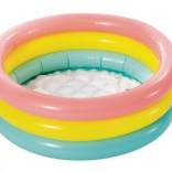 Drei aufblasbare Ringe in kräftigen Schattierungen von Rosa, Gelb und Grün verleihen dem Pool Attraktivität und laden Kinder zum Spielen ein.
