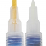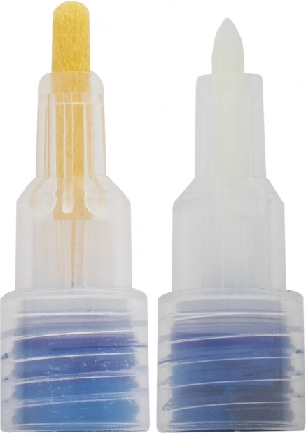 Die feine Spitze ist ideal für Details, Konturen und Schrift, während die breitere Spitze Flächen leicht ausmalt und für starke Deckkraft sorgt. Für optimale Ergebnisse die Oberfläche vor dem Auftragen reinigen; neue Marker zunächst aktivieren und auf Papier testen.