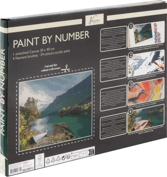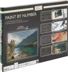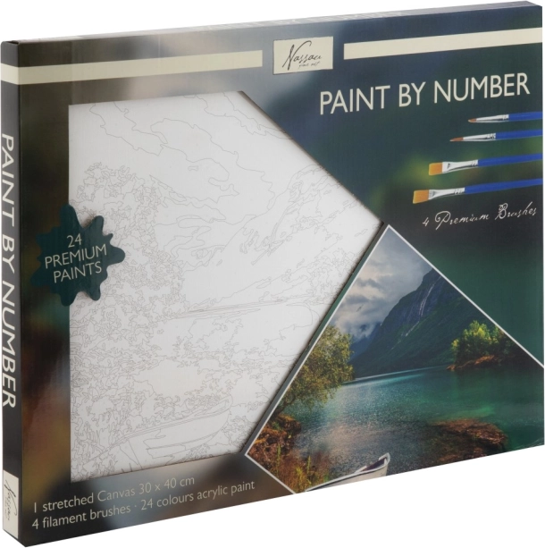 Im Set enthalten sind eine aufgespannte Leinwand 30 × 40 cm mit vorgedruckten Zahlen, 24 Acrylfarben und 4 Pinsel (2 flache, 2 runde) – ganz ohne zusätzliches Nachkaufen.