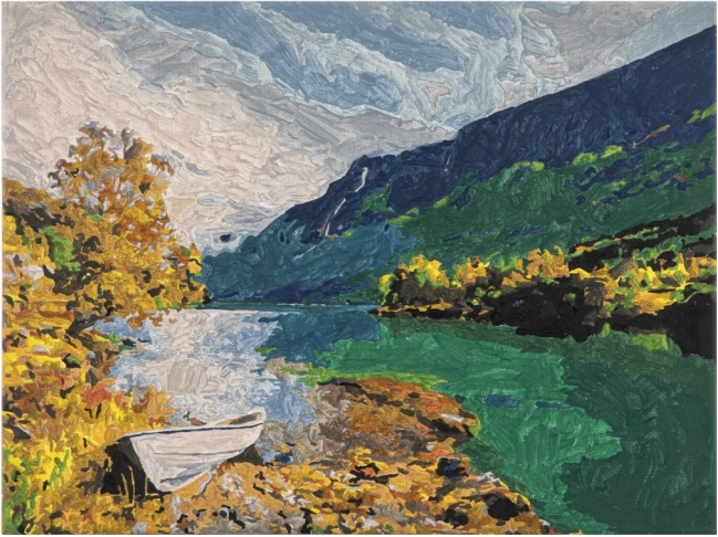 Das Ergebnis ist eine harmonische Naturszene mit See und Bergen, die zu einer eleganten Dekoration für Ihr Interieur wird.