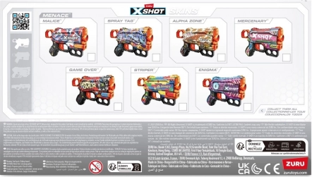 Die X-Shot Skins Serie von Werfern bietet die Möglichkeit, das Aussehen der Waffe zu personalisieren – so, wie Kinder und Erwachsene es aus Videospielen kennen! Der X-Shot Skins Menace ist in 7 einzigartigen Skins (Farbvarianten) erhältlich, aus denen du wählen kannst. Stelle dir dein eigenes Arsenal an Looks zusammen und vertraue auf die Zuverlässigkeit deines Blasters bei jeder Verwendung! Die Waffe verfügt über ein unteres Staufach für zwei Pfeile, sodass die Munition immer griffbereit ist!