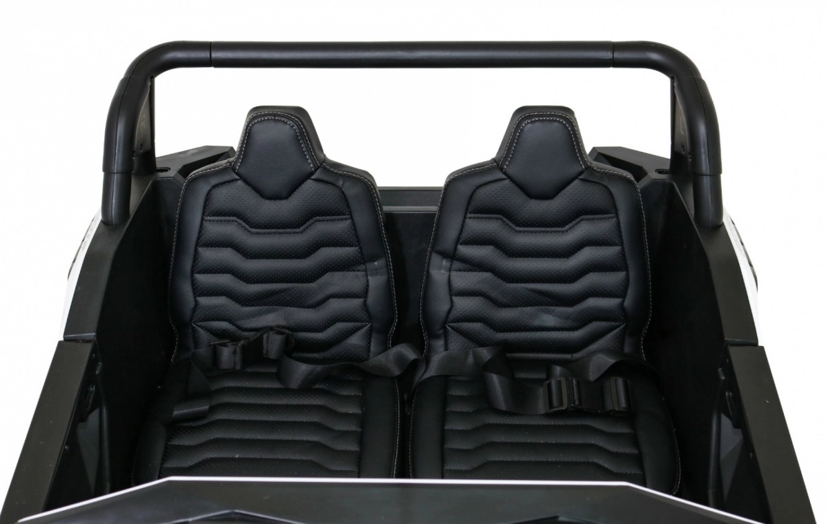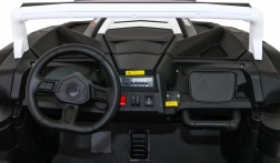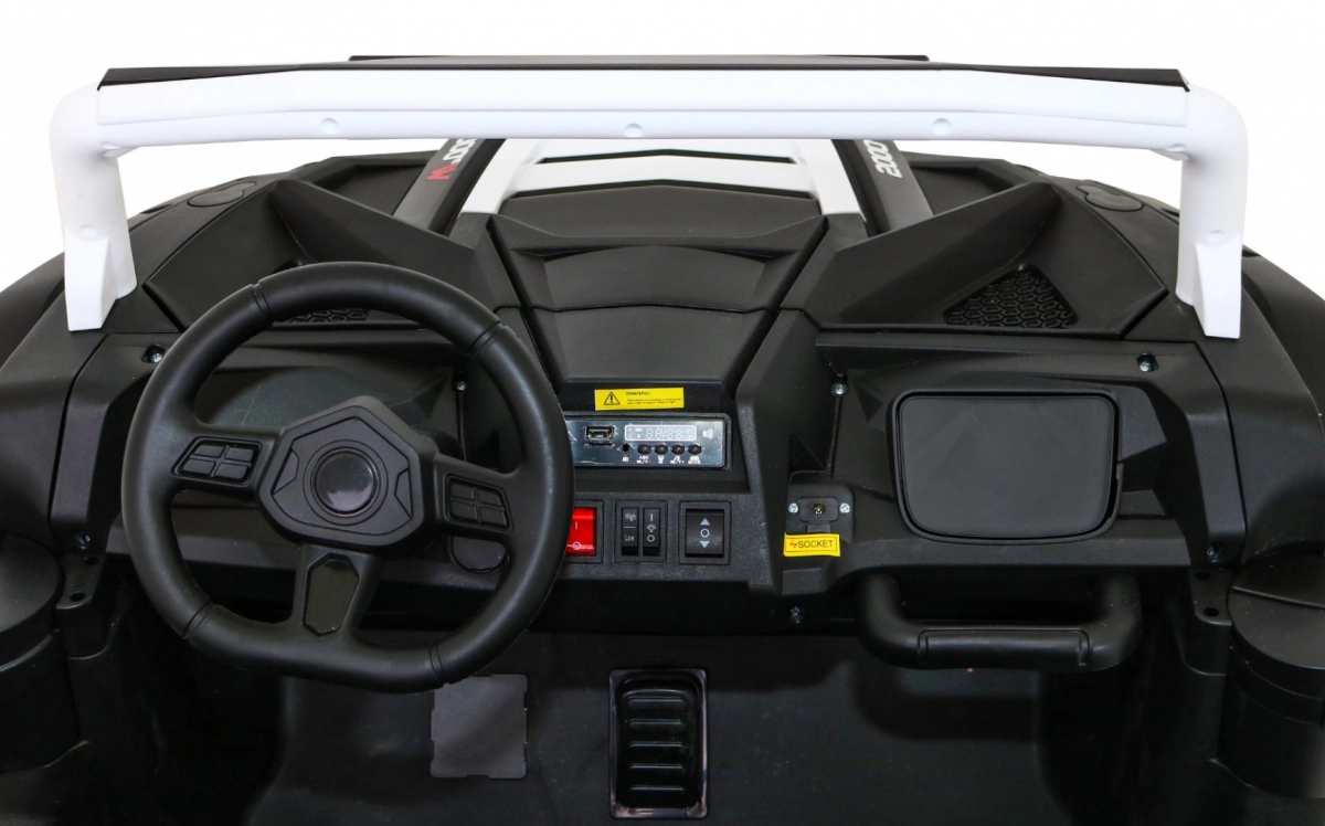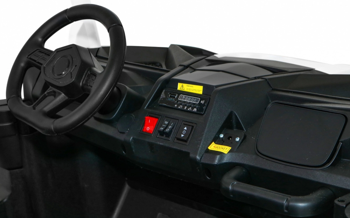 Audio-Panel mit MP3/USB/AUX/Bluetooth und Sounds im Lenkrad. Eltern behalten die Kontrolle dank 2,4-GHz-Fernbedienung mit Stopp-Funktion und 3 Geschwindigkeitsstufen.