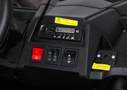 Der Innenraum überzeugt mit einem belüfteten Sitz aus Eco-Leder mit Sicherheitsgurten und 3-stufiger Verstellung (60×26×32 cm). Kinder genießen Musik über MP3, USB, AUX und Bluetooth sowie lustige Sounds im Lenkrad. Eltern behalten die Kontrolle mit der 2,4-GHz-Fernbedienung (3 Geschwindigkeiten, Sicherheits-Stop-Taste). Praktisch sind öffnende Türen, Ladeanzeige und realistisches Starten mit Motorsound.