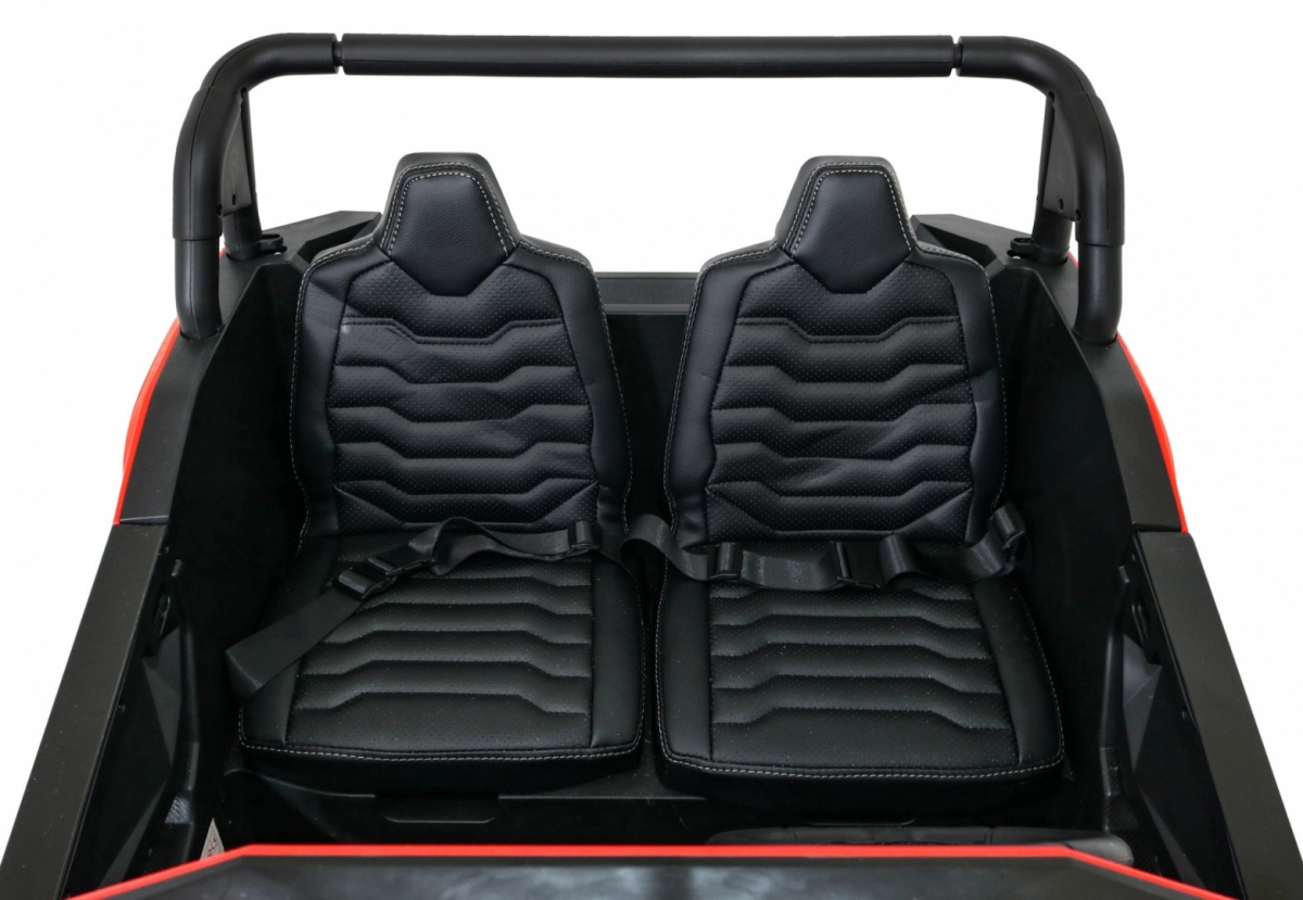 Breiter Sitz aus Eco-Leder mit Belüftung, Sicherheitsgurte und 2,4-GHz-Fernsteuerung mit Not-Stop-Taste für beruhigte Eltern.