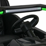 LED-Beleuchtung vorne und hinten mit Schalter, realistische Motorgeräusche und Audiopanel MP3/USB/AUX/Bluetooth. Lenkrad mit integrierten Sounds.