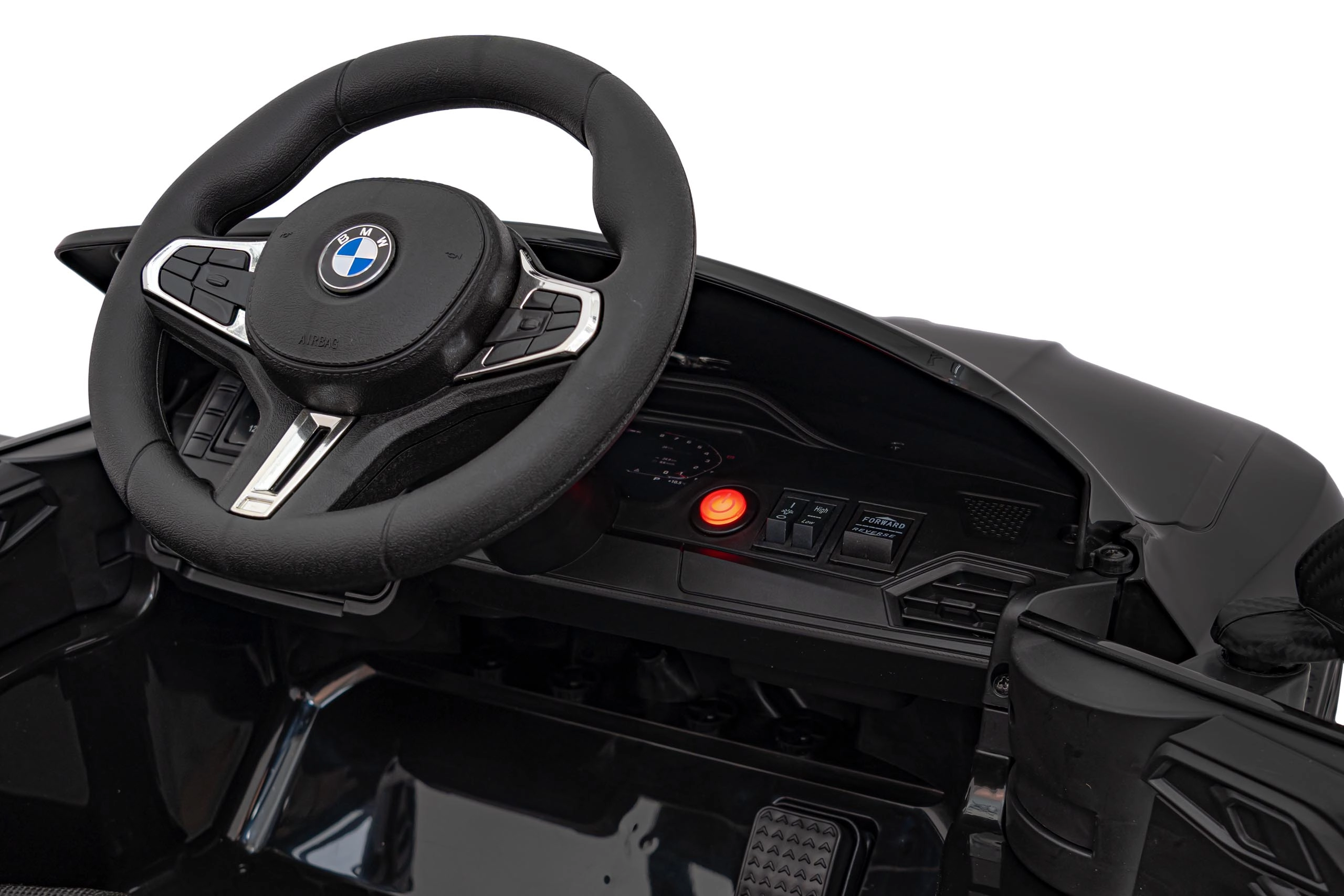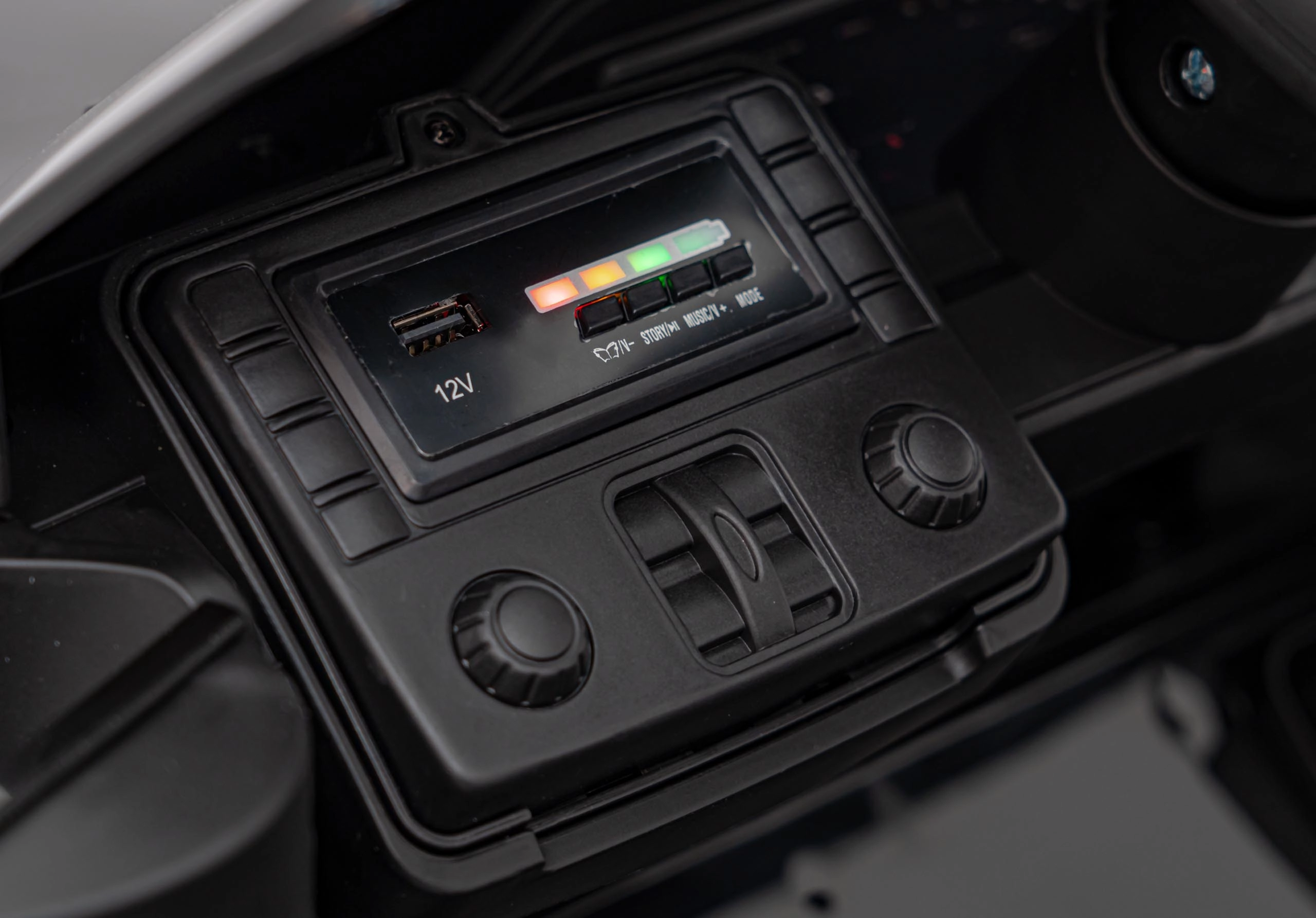 Eltern schätzen die 2,4-GHz-Fernsteuerung mit drei Geschwindigkeiten und der Not-STOP-Taste. Öffnende Türen, der beleuchtete Startknopf und ein übersichtlicher Voltmeter erhöhen den Komfort, während der Sitz aus Ökoleder mit Sicherheitsgurten für Bequemlichkeit und Sicherheit sorgt.