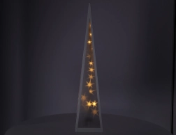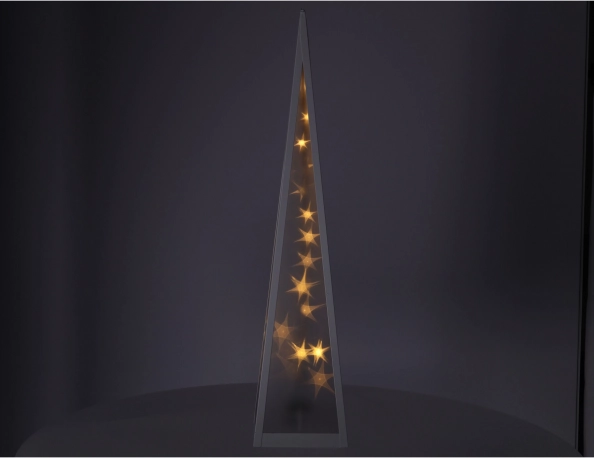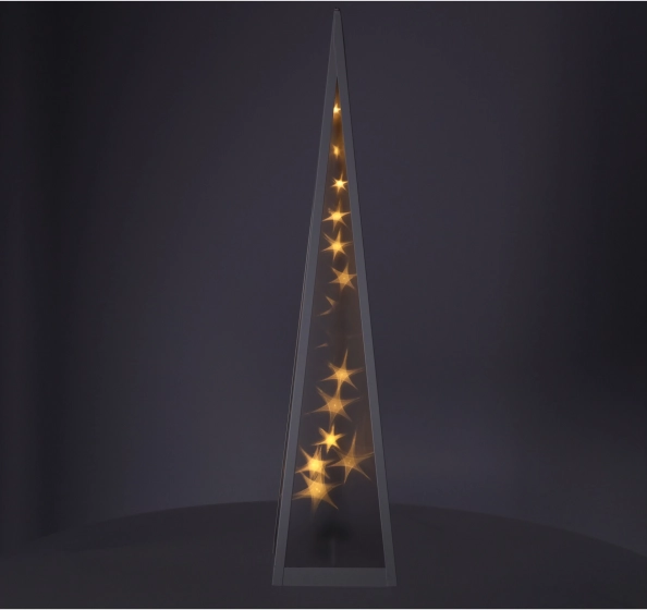 Kunststoffpyramide mit weißem Metallrahmen, gefüllt mit Sternchen, die sich in der Mitte der Pyramide bewegen ✨