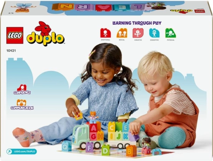 Das LEGO DUPLO Set Alphabet-Lastwagen bietet Kindern einen spielerischen Einstieg in die Welt der Buchstaben. Dank großer, leicht greifbarer Teile lernen Kleinkinder Farben, Buchstaben und das einfache Bilden von Wörtern, während sie die Hand-Auge-Koordination trainieren. Der fahrbare Lastwagen mit abnehmbarem Anhänger und zwei Figuren lädt zum offenen, fantasievollen Rollenspiel ein.