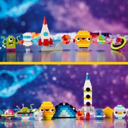 Dieses kreative Bauset lädt kleine Entdecker in die Welt des Weltraums ein: Bauen Sie eine Rakete, eine Astronautin, einen lustigen Außerirdischen und ein Mini-Sonnensystem (Mars, Erde, Sonne und Saturn mit Ringen). Dank leuchtender Farben, vielseitiger Elemente und Leuchtteilen lassen sich Modelle ganz einfach umbauen und neue Kombinationen ausprobieren.
