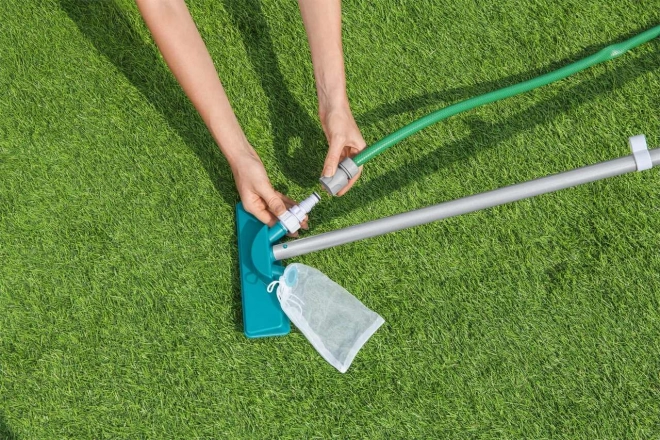 Das Set enthält Komponenten wie einen Staubsauger und ein Netz zur effektiven Schmutzbeseitigung aus dem Pool.