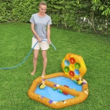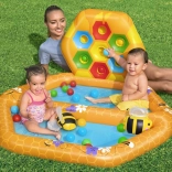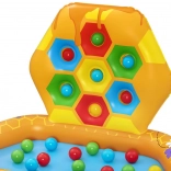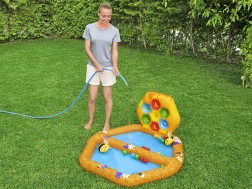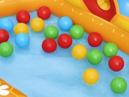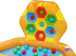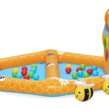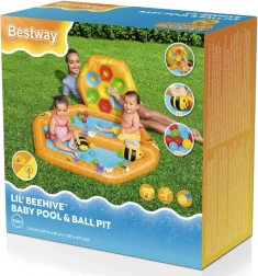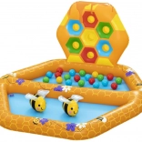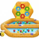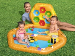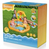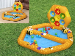 Das Set beinhaltet ein separates Becken gefüllt mit Bällen, zwei Puffy Pal Spielzeuge in Bienenform, zwanzig Plastikbälle und ein Reparaturkit. Die Maße des Beckens sind 127 cm x 119 cm x 61 cm.