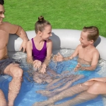 Genießen Sie sommerliche Entspannung mit dem aufblasbaren Eckpool BESTWAY in den Maßen 213 × 206 × 53 cm. Er bietet schnelles Auf- und Ablassen der Luft, eine stabile Konstruktion mit zwei Luftkammern, breite, weiche Wände zum bequemen Anlehnen, integrierte aufblasbare Rückenlehnen mit Kissen und Getränkehalter. Eine großartige Wahl für die Familienentspannung im Garten.