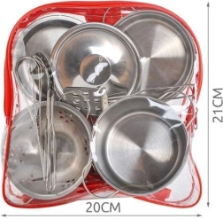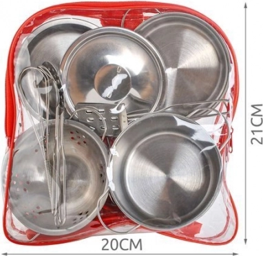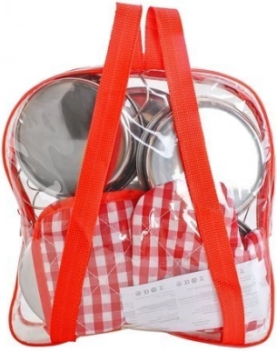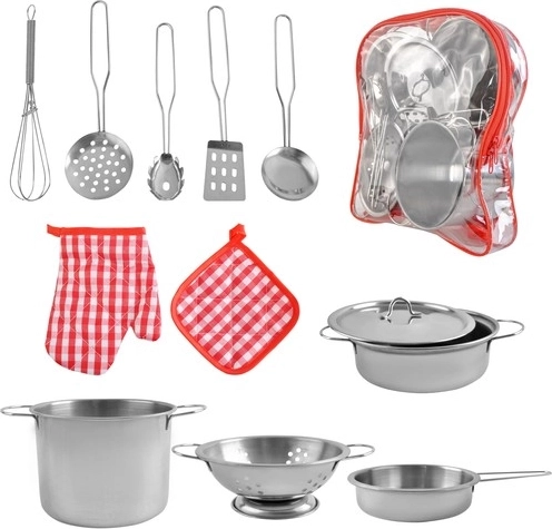 - 13-teiliges Set - Enthält 2 Töpfe, eine Pfanne, ein Sieb, einen Deckel, verschiedene Löffel, einen durchsichtigen Rucksack und eine Stoffunterlage mit Handschuh.