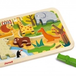Entdecken Sie das unterhaltsame Holzpuzzle mit ZOO-Motiv von JANOD, das die Feinmotorik, das Lernen von Formen und Farben fördert und sicheres Spielen ab 12 Monaten bietet. Sieben bunte Tiere können in die Grundplatte eingesetzt oder als einzelne Figuren für kreatives Spiel genutzt werden.