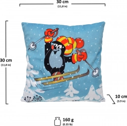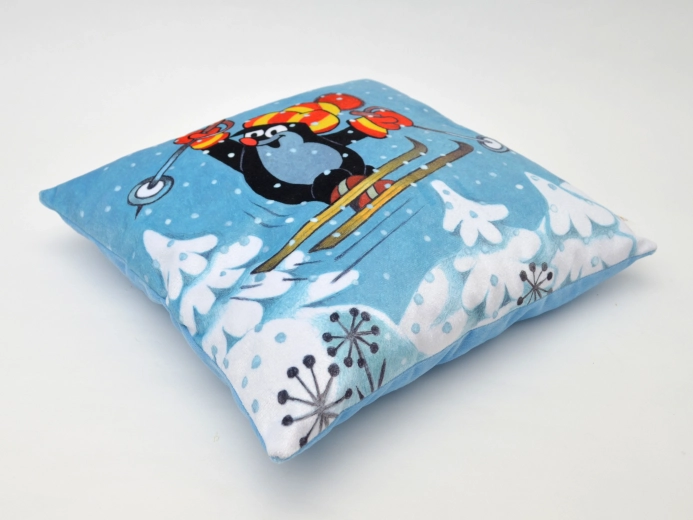 Das Kissen ist aus Mikrovelours gefertigt, was seine Weichheit und Bequemlichkeit garantiert. Auf der Vorderseite befindet sich ein Druck des Maulwurfs, der immer ein beliebter Held der Kinder ist. Die Rückseite ist in hellem Blau gehalten, was jedes Kinderzimmer wunderbar ergänzt.