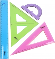 Alle Teile des Sets sind für präzises Zeichnen und Messen ausgelegt, geeignet für Mathematik, Geometrie und technisches Zeichnen. Die farbige Ausführung unterstützt die schnelle Orientierung und motiviert Kinder zur Arbeit mit den Hilfsmitteln.