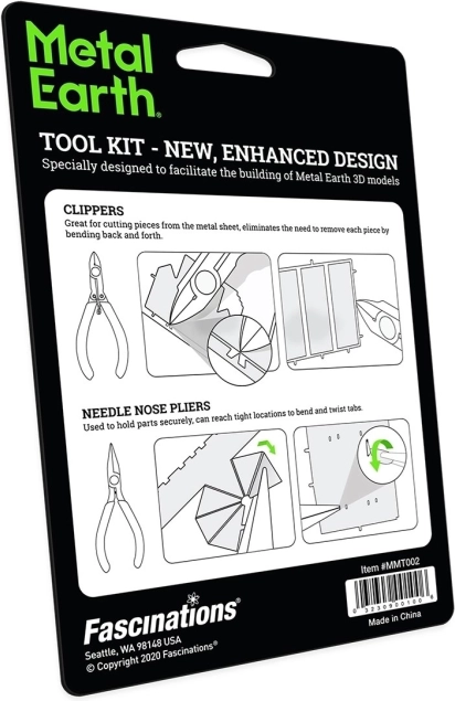 Das METAL EARTH Zangenset ist ein passendes Zubehör nicht nur für das Zusammenbauen der METAL EARTH 3D-Puzzles. Lieferumfang: - Seitenschneider, - Spitzzange. Diese praktischen Helfer sind nützlich beim Zusammenbauen der 3D-Stahlpuzzle-Modelle von METAL EARTH, beim Ausknipsen der Teile aus den Metallplatten und beim Biegen der kleinen Laschen, mit denen die einzelnen Teile miteinander verbunden sind.