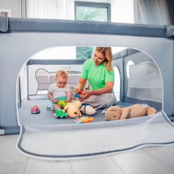 Das Laufgitter bietet einen sicheren Spielbereich ohne störende Elemente im Inneren – alle Konstruktionsteile befinden sich außen. Weiche Netzseiten ermöglichen es dem Kind, Aufstehen, erste Schritte oder Drehen mit minimalem Risiko zu üben und bieten zugleich hervorragende Sicht für die Eltern. Höhere, stabile Wände verhindern ein unbeabsichtigtes Verlassen, sodass das Kind einen übersichtlichen und geschützten Bereich für den Alltagsspaß hat.