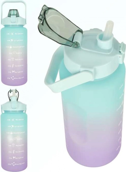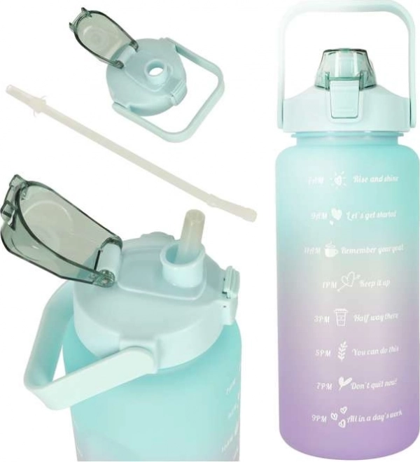 Sport-Wasserflasche 2 l mit praktischem Trinkhalm, auslaufsicherem Deckel und motivierenden Zeitmarkierungen hilft, den Trinkrhythmus einzuhalten – zu Hause, im Fitnessstudio und unterwegs. Die weite Öffnung erleichtert die Reinigung sowie das Hinzufügen von Eis oder Obst, der bequeme Tragegriff sorgt für einfaches Mitnehmen.