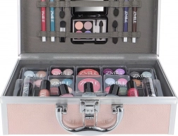 Kosmetikkoffer Rosa „Eye-Catcher“ mit integriertem Spiegel – insgesamt 42 Zubehörteile. Enthält 24× Lidschatten, 2× Nagellack, 1× Glitzer-Nagellack, 1× Rouge, 2× Lippenstift, 2× Lipgloss, 3× Kajalstift, 1× Eyeliner, 3× doppelseitigen Applikator, 1× Pinsel. Dermatologisch getestet, entspricht den strengen EU-Normen.
