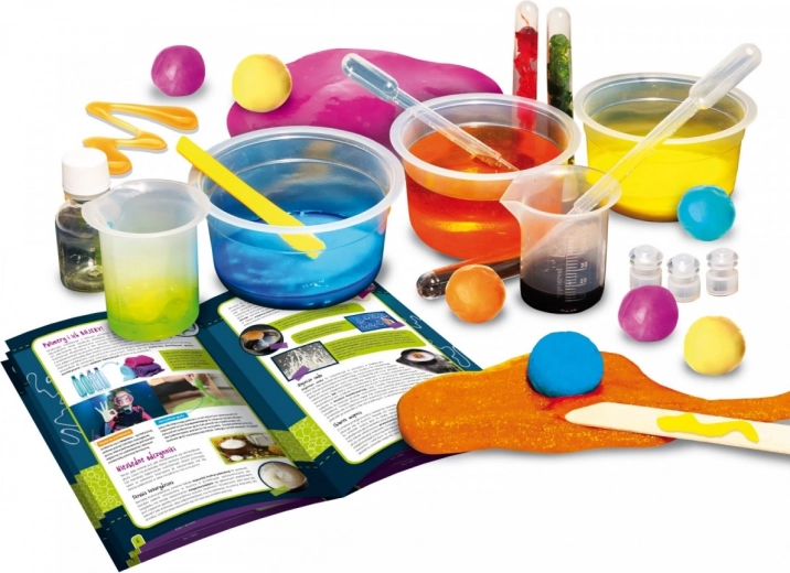 Ein faszinierendes und zugleich robustes Bauset, mit dem Kinder aus klebriger Masse lustige und kreative Dinge herstellen, darunter Springbälle, Monsterzellen, kinetischen Sand, ziehbares Gelee oder spaßige Knete. Das Produkt enthält sichere Reagenzien. Hinweis: Die Massen ändern ihre Farbe und springen! Inhalt: Schutzbrille, Pipette, Spatel, Reagenzien, Farbstoffe, Messbecher, Flasche, Reagenzgläser.