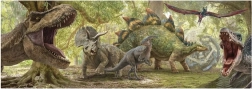 Dieses Puzzle enthält detaillierte Illustrationen von verschiedenen Dinosauriern, vom Tyrannosaurus bis zum Triceratops, in ihrer natürlichen Umgebung.