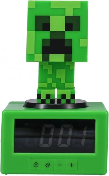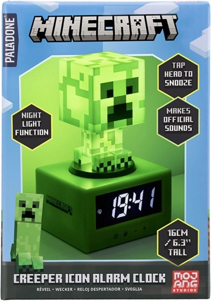 Offizieller Wecker für Minecraft-Fans mit ikonischem Creeper-Look und praktischen Funktionen für ein bequemes Aufstehen. Durch Drücken des Kopfes aktivieren Sie das Nachtlicht, mit einem sanften Tippen aktivieren Sie die Schlummerfunktion. Digitalanzeige, Betrieb mit 3× AA und Höhe 16 cm machen ihn zu einem stylischen Accessoire für jeden Nachttisch.