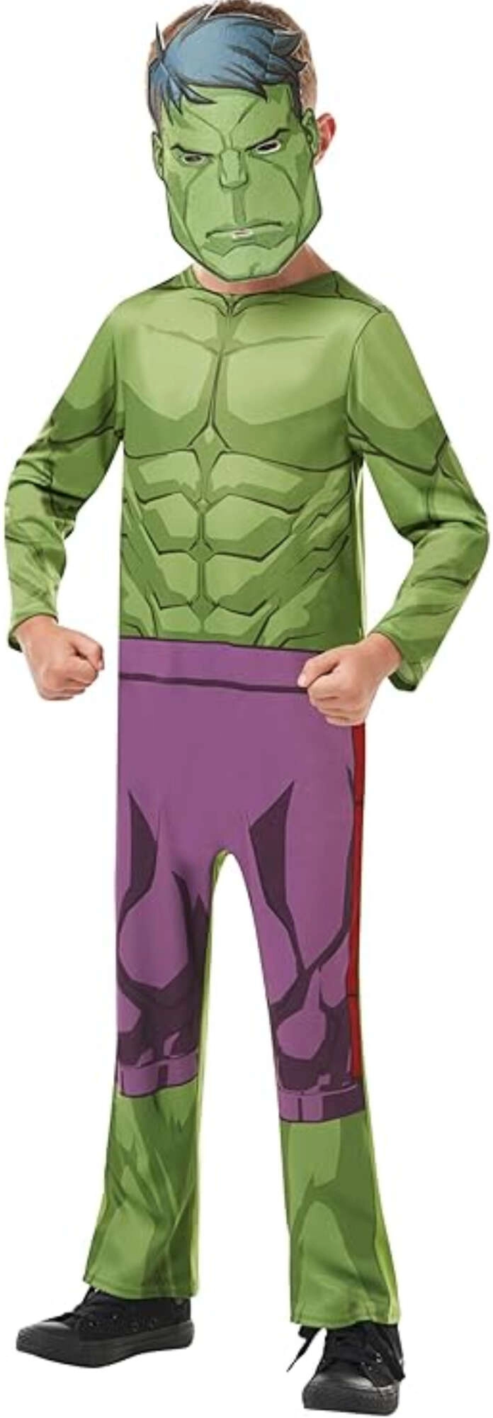 Dieses HULK-Kinderkostüm ahmt das Aussehen des beliebten Superhelden originalgetreu nach – der grüne Körper mit markanter Muskelstruktur und die typischen lilafarbenen „Hosen“ sind direkt auf den weichen Stoffoverall gedruckt. Ebenfalls enthalten ist eine Gesichtsmaske, die den gesamten Look perfekt abrundet.