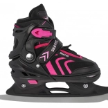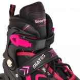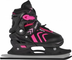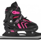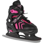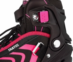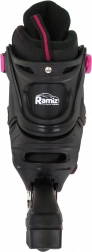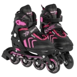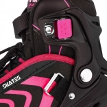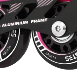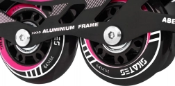 Komfort bietet die profilierte Einlage mit weichem EVA-Schaum, bezogen mit angenehmem Velvet-Material. Das dreifache Verschlusssystem – Schnürsenkel, Klettverschluss und Sicherheitsschnalle – hält den Fuß fest und zuverlässig. Das Aluminiumfahrgestell für die Rollen, PU-Rollen 64×24 mm mit Härte 85A und ABEC-7-Lager sorgen für eine ruhige und stabile Fahrt. Die Eiskufen aus Edelstahl sind pflegeleicht und bieten hervorragendes Gleiten.