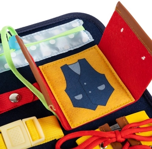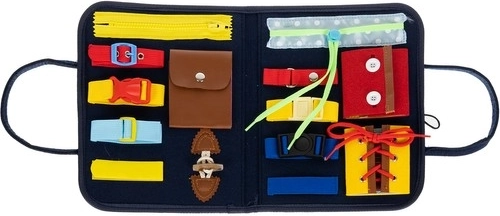 Enthält 14 verschiedene Elemente, darunter Reißverschlüsse, Schnallen, Knöpfe und mehr, die praktische Fähigkeiten und Selbstständigkeit fördern.