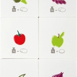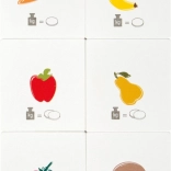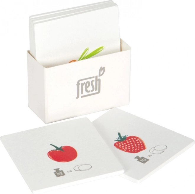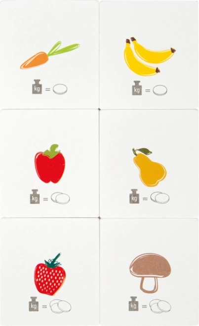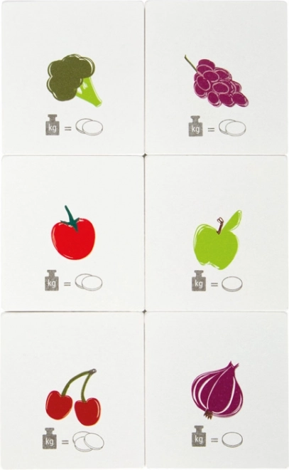 Sechs beidseitige Karten mit Obst und Gemüse sowie Münzsymbolen helfen Kindern, Werte zu verstehen und Preise spielerisch zu vergleichen.