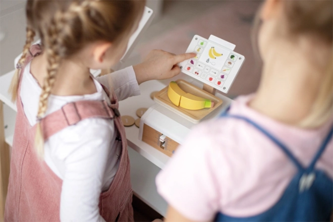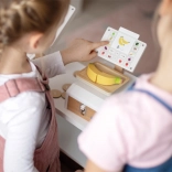 Zum Lieferumfang gehören sechs beidseitig bedruckte Karten mit Lebensmitteln und Münzsymbolen, die Kindern anschaulich zeigen, dass mehr Münzen einen höheren Preis pro Kilogramm bedeuten. Das Spiel fördert ganz natürlich grundlegende mathematische Fähigkeiten, Feinmotorik und Hand-Auge-Koordination. Die robuste Ausführung aus Holz und Kunststoff sorgt für Langlebigkeit und sichere Nutzung.