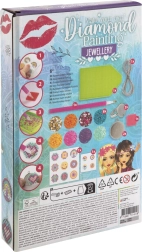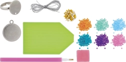 - 8 Farben Steinchen, Applikator, Organizer, Kette, Ringschablone, Anhängerschablone, 1 Bogen Ringaufkleber, 1 Bogen Anhängeraufkleber