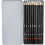 Das Set mit 10 Graphitstiften deckt den gesamten Bereich für kreatives Arbeiten ab: von weichen Stiften für satte Schatten und expressive Striche bis hin zu harten für feine Details und technische Linien. Das beiliegende Metalletui schützt die Stifte beim Transport und sorgt für Ordnung im Atelier und in der Schule.