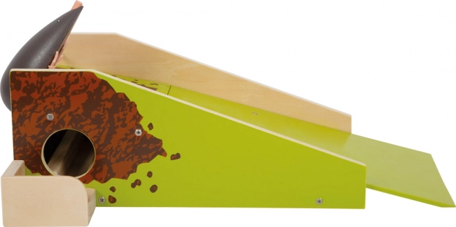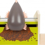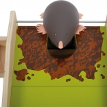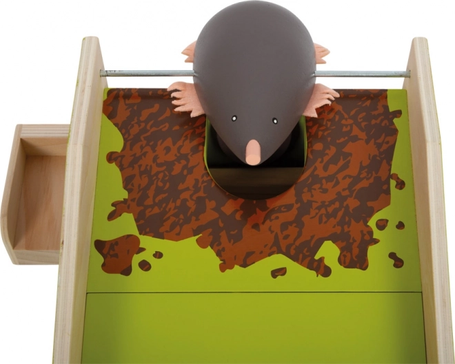 Ein spezieller Mechanismus hebt den Maulwurf an, sobald der Ball den Tunnel passiert – das "Winken" liefert sofortiges Feedback und motiviert Kinder zum Wiederholen.