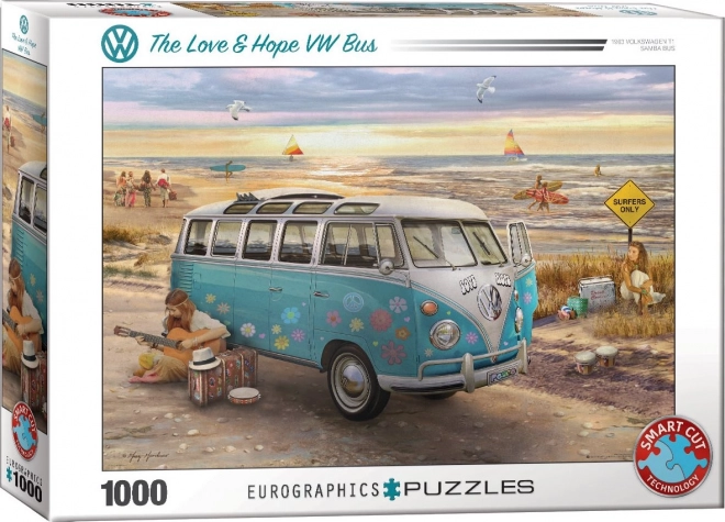 Genießen Sie ein durchdachtes Puzzle der Marke Eurographics mit dem Motiv VW Bus – Liebe und Hoffnung. Dank einer speziellen Stanzung ohne Raster besitzen die Teile einzigartige Formen und nicht immer bündige Kanten, was ein anspruchsvolleres und unterhaltsameres Zusammensetzen bietet.