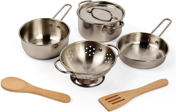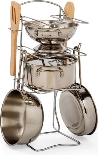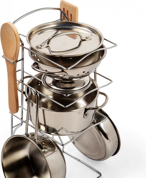 Mit diesem 8-teiligen Set erhalten Kinder die Möglichkeit und Werkzeuge für das pretentiöse Kochen. Es umfasst realistisch aussehendes Metallkochgeschirr, wie ein Sieb, eine Pfanne, zwei Töpfe mit Deckel sowie einen Holzlöffel mit Wender auf einem praktischen Ständer. Ideal zur Förderung von Kreativität, Sprachentwicklung und sozialen Fähigkeiten.