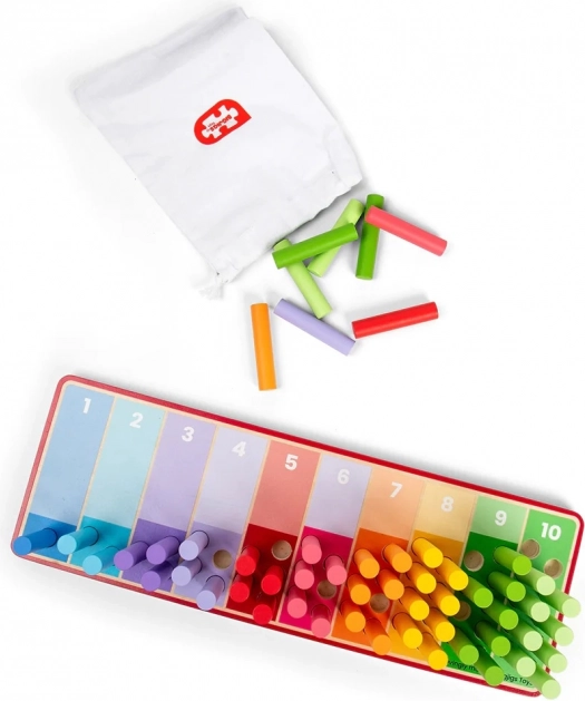 Regenbogen-Rechenstäbchen sind die ideale Wahl für Kinder ab 18 Monaten, die Zählen und Farben erkennen lernen möchten. Das Spielzeug enthält ein hölzernes Brett mit farblich markierten Bereichen und 55 bunte Stäbchen, die in diese Bereiche eingefügt werden können. Alle Teile dieses Produkts sind aus FSC®-zertifiziertem Holz gefertigt und daher nicht nur sicher für Kinder, sondern auch umweltfreundlich.