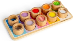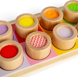 Dieses großartige Sensorikbrett ist der perfekte Weg, um Kinder mit verschiedenen Texturen und Farben vertraut zu machen. Es enthält ein Holzbrett mit bunten Öffnungen und elf Einlegeteile, von denen jedes eine einzigartige Oberflächenbeschaffenheit hat, von geriffeltem Silikon bis hin zu weichem Filz. Dieses Spielzeug hilft nicht nur, verschiedene Texturen zu unterscheiden, sondern fördert auch die Hand-Auge-Koordination.