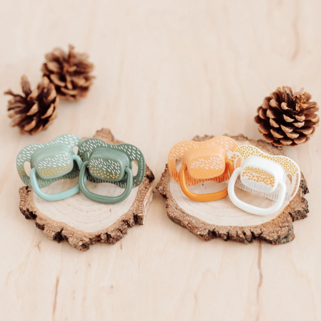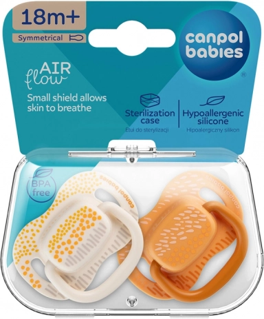 Das Set Canpol babies Mountains 18m+ enthält 2 hochwertige symmetrische Schnuller, die für Komfort und Sicherheit von Kleinkindern entwickelt wurden. Die symmetrische Form unterstützt den natürlichen Saugrhythmus und die korrekte Sprachentwicklung, während die weiche Silikonspitze von Kindern leicht akzeptiert wird.