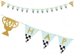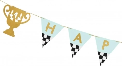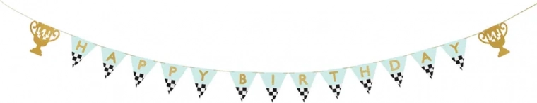 Der Banner kommt in hellen Blau- und schwarz-weißen Schachmustern, die zusammen mit den Trophäen ein sportliches Aussehen verleihen. Er eignet sich nicht nur für Kinder-, sondern auch für Erwachsenenfeiern.