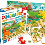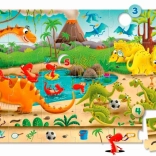 Aber das ist erst der Anfang des Spaßes. Dieses Puzzle trainiert nicht nur die Feinmotorik, sondern fördert auch Gespräche, bei denen dein Kind seinen Wortschatz erweitert, indem es beschreibt, was es auf dem Bild sieht, und einfache Fragen beantwortet. Das Suchen nach hervorgehobenen Objekten schult den Beobachtungssinn und prüft so die Aufmerksamkeit der Kinder; der Platz für die Spielsteine bei jeder Dinosauriergruppe hilft ihnen zudem, bis 5 zu zählen.
