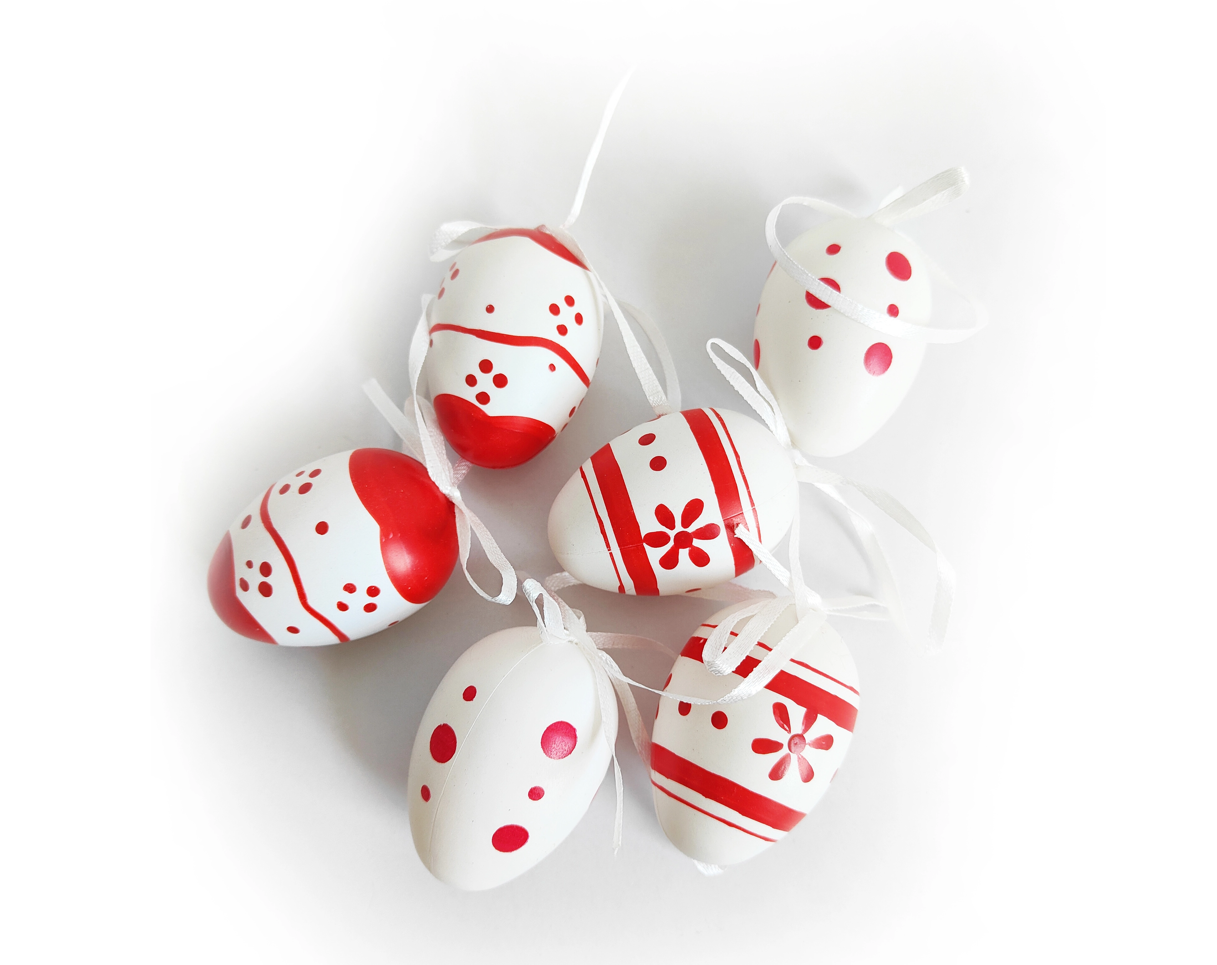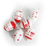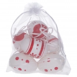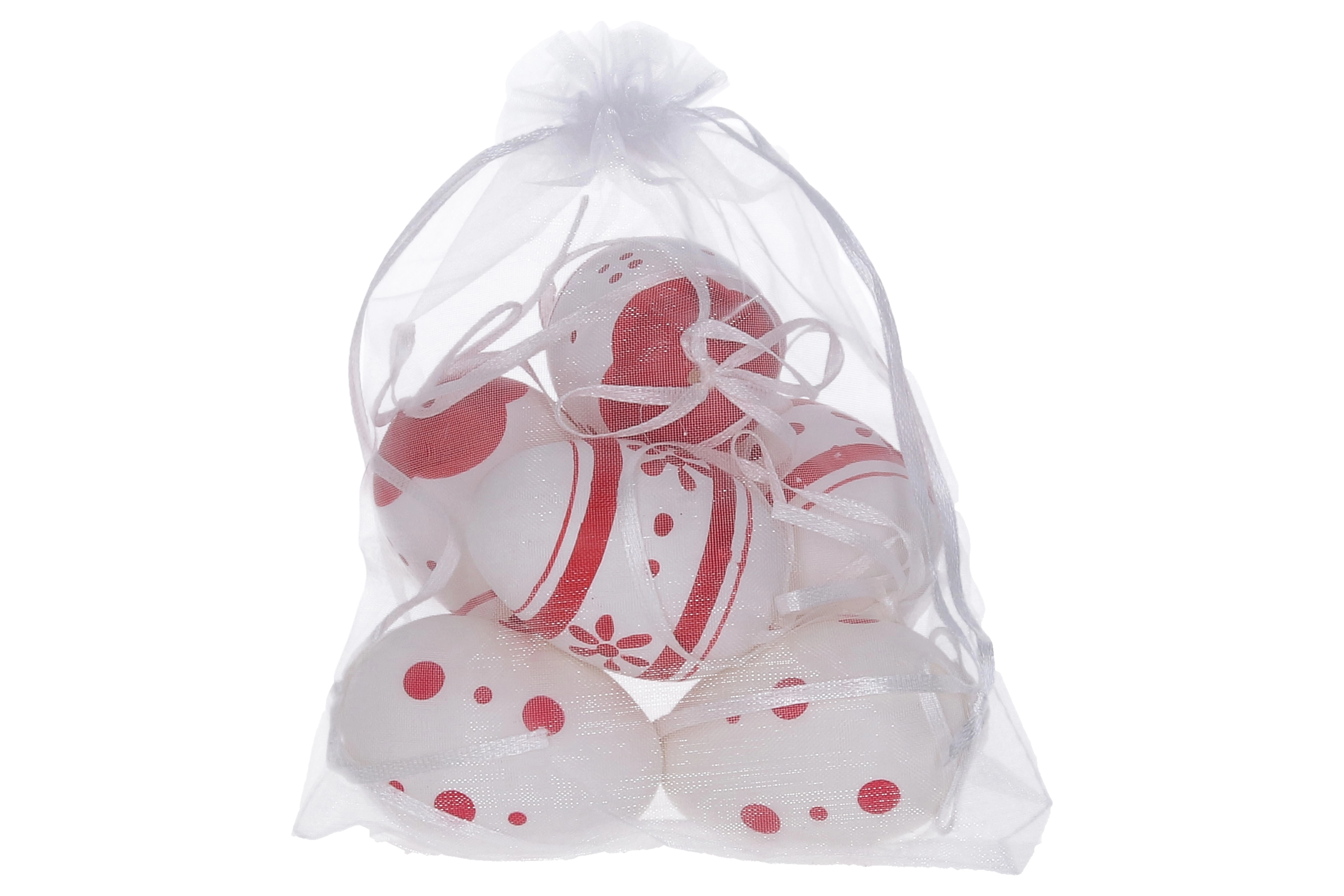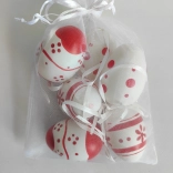 Dekorative, bemalte Plastikeier in der Größe von 6 cm sind ideal für Ihre festlichen Dekorationen. Sie erhalten 6 Stück in einem eleganten Organzasäckchen.