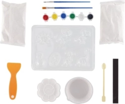 - Lieferumfang: Gips, Formwerkzeuge, Pinsel und Farbenset.
